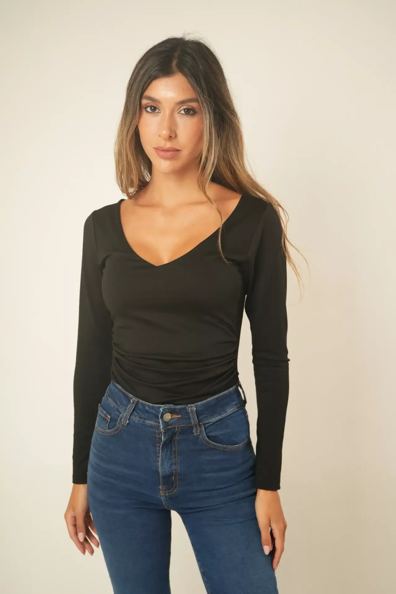 D101 – Body Solenne Escote V Manga Larga Frunce Lateral Modal Soft